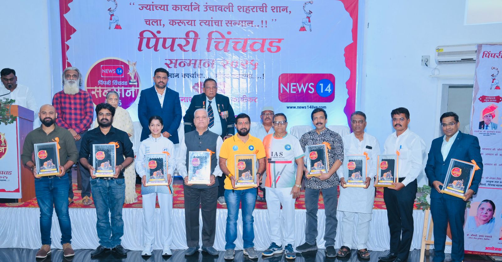 पिंपरी चिंचवड : शहरातील विविध क्षेत्रांत उल्लेखनीय कार्य करणाऱ्या व्यक्तींच्या सन्मानार्थ न्यूज १४ मिडीया आयोजित पिंपरी चिंचवड सन्मान सोहळा 2025, उत्साहात पार पडला. या कार्यक्रमात कला, क्रीडा, शिक्षण, समाजसेवा, उद्योजकता आणि आरोग्य क्षेत्रात उत्कृष्ट योगदान देणाऱ्या मान्यवरांना गौरविण्यात आले. पद्मश्री मुरलीकांत पेटकर यांच्या अध्यक्षतेखाली हा कार्यक्रम संपन्न झाला.