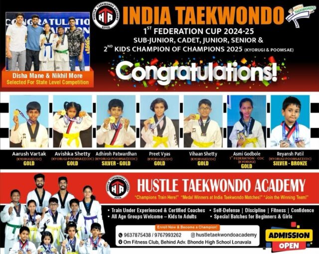 ‘हसल टायक्वांदो अकॅडमी’ने या स्पर्धेत आपली ताकद दाखवत पुन्हा एकदा सिद्ध केले की ज्या पातळीवर सातत्याने मेहनत घेतली जाते, तिथे यश नक्कीच मिळते.