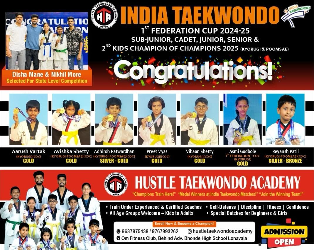 नाशिक येथे २५ ते ३० एप्रिल २०२५ दरम्यान पार पडलेल्या INDIA TAEKWONDO FEDERATION CUP 2024–25 & 2nd KIDS CHAMPION OF CHAMPIONS 2025 (Kyorugi & Poomsae) स्पर्धेमध्ये ‘हसल टायक्वांदो अकॅडमी’च्या चिमुकल्यांनी अप्रतिम कामगिरी करत सर्वांचे लक्ष वेधून घेतले. विविध वयोगटांतील खेळाडूंनी सुवर्ण, रौप्य आणि कांस्य पदकांची लयलूट करत महाराष्ट्राचे आणि विशेषतः अकॅडमीचे नाव उज्वल केले.
