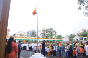 तळेगाव दाभाडे शहरात आज ७९ वा स्वातंत्र्य दिन अत्यंत दिमाखात आणि उत्साहात साजरा करण्यात आला. शहरातील विद्याविहार कॉलनीत भव्य ध्वजारोहण सोहळा पार पडला. या वेळी सुभेदार श्री. विष्णूजी पठाडे यांच्या हस्ते राष्ट्रीय ध्वज फडकावण्यात आला. देशभक्तीपर गीतांचा गजर, “भारत माता की जय” आणि “वंदे मातरम”च्या घोषणांनी परिसर दुमदुमून गेला. नागरिक, महिला, युवा आणि बालकांनी मोठ्या उत्साहात या ऐतिहासिक क्षणाचा आनंद साजरा केला.