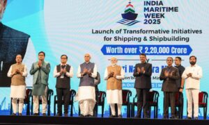 मुंबई येथे प्रधानमंत्री नरेंद्र मोदी आणि मुख्यमंत्री देवेंद्र फडणवीस यांच्या प्रमुख उपस्थितीत ‘इंडिया मेरीटाईम वीक 2025’ अंतर्गत ‘मेरीटाईम लीडर्स कॉन्क्लेव’चा भव्य उद्घाटन सोहळा पार पडला. या महत्त्वाच्या कार्यक्रमाला राज्यपाल आचार्य देवव्रत, केंद्रीय मंत्री सर्बानंद सोनोवाल, केंद्रीय राज्यमंत्री शांतनू ठाकुर, केंद्रीय राज्यमंत्री कीर्ती वर्धन सिंह, उपमुख्यमंत्री एकनाथ शिंदे, उपमुख्यमंत्री अजित पवार तसेच सागरी क्षेत्रातील अनेक मान्यवर उपस्थित होते.
